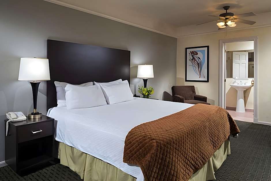 This guest room features a king sized bed, WiFi access, a flat-screen TV with cable, plush bathrobes, luxury bath amenities and daily continental breakfast.